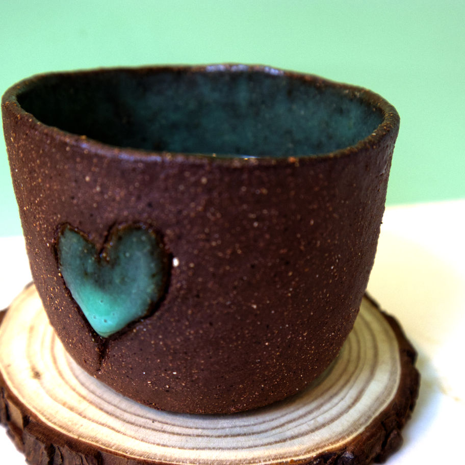 Handmade Terracota Cup with Heart – Rustic Brown & Deep Green – Ceramic Tumbler